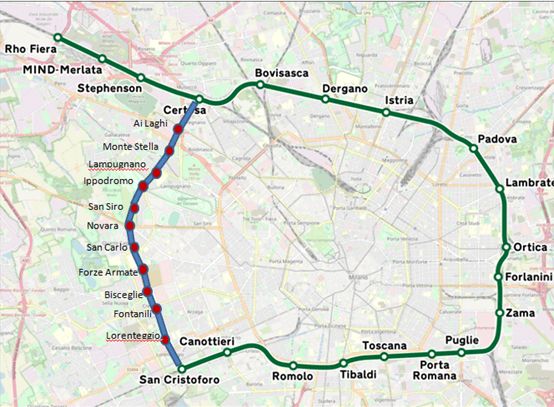 Partiamo proprio da San Cristoforo con interscambio con la recente M4, poi, in senso antiorario, ci sarà Canottieri, Romolo con interscambio M2, Tibaldi dove 2 anni fa è stata inaugurata la nuova stazione, poi Toscana, Porta Romana dove sono in corso i lavori di riqualificazione. Quindi Puglie, Zama, Forlanini FS con interscambio con M4 e Passante, Ortica, Lambrate con interscambio M2 il passante ferroviario e molti treni nazionali. Poi Padova, Istria con interscambio M5, Dergano con interscambio M3, Bovisasca, Certosa con interscambio Passante, Stephenson, Mind Cascina Merlata e Rho Fiera con interscambio M1 per un totale di 19 stazioni.