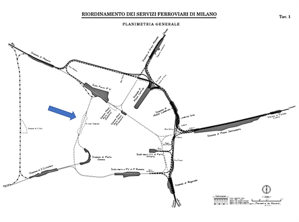 …… In questo quartiere al di là di Lampugnano e dell’Ippodromo si svilupperà la nuova linea ferroviaria che collegherà le stazioni di Milano Certosa e di Milano San Cristoforo. È inevitabile che Milano, maggior centro industriale del Regno e nodo ferroviario della maggiore importanza sia contornato da una corona di stazioni secondarie e da una linea ferroviaria che le colleghi. È tuttavia necessario che la linea ferroviaria ostacoli il meno possibile il naturale sviluppo della città…….
