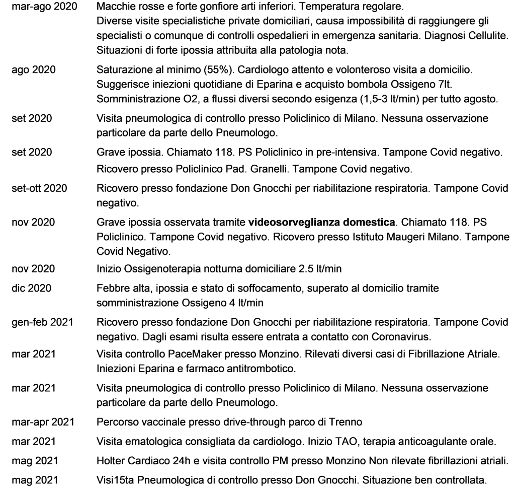 Da sempre collaborativa con i medici e attenta all’aderenza terapeutica, prima della pandemia Covid si sottoponeva a regolari visite di controllo presso specialisti del policlinico di Milano, attenendosi in modo scrupoloso all’adeguamento progressivo della terapia farmacologica.