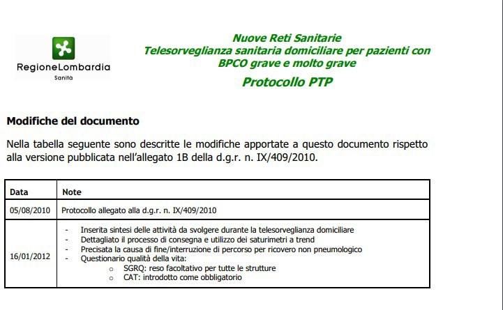 Dal CEFRIEL si viene a conoscenza che nel 2012 venne definito un protocollo di telesorveglianza Sanitaria Domiciliare per pazienti con BPCO, che a Milano non risulta implementato. Gennaio 2021 si contatta il Papa Giovanni XXXIII di Bergamo e Maugeri di Brescia. Molto cortesi le risposte dei medici specialisti ma non risulta possibile attivare teleassistenza su Milano; Regione Lombardia comunica l’esistenza di qualcosa su Varese. Il Caregiver rinuncia ed invita la Regione ad una migliore comunicazione su questo tema.