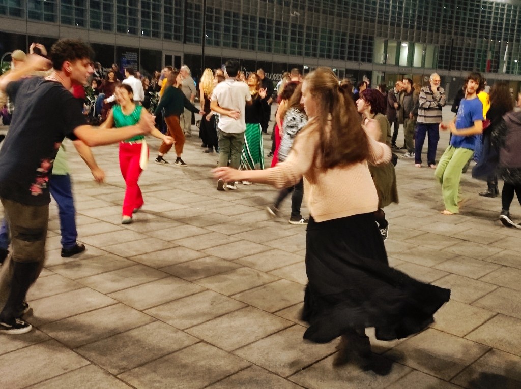 2. Qualche sera più tardi, invitato da un amico, sono stato spettatore di un happening a me sconosciuto, chiamato “Mazurka Klandestina”. (Ho saputo solo in seguito che l’evento si svolge regolarmente in diverse città italiane, anche a vantaggio di altre forme di ballo). Verso le 22, in una delle piazze più suggestive del centro di Milano, si è radunato un gruppo di circa 150-200 persone che, al suono della musica riprodotta da una cassa bluetooth, hanno danzato fino a notte inoltrata. Una sorta di flash mob, semplicemente poco flash… Finita la musica, la piazza è tornata all’antico silenzio delle sue pietre, senza alcun segno di sporcizia o di degrado.