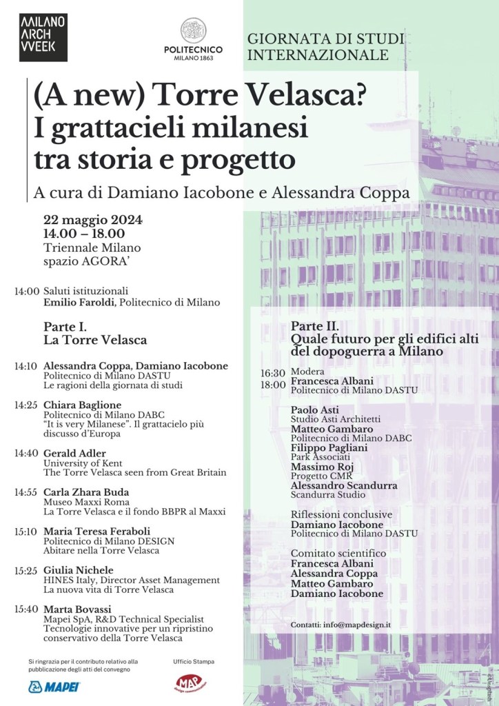 Il 22 maggio scorso alla Triennale di Milano, nell’ambito della Milano Arch Week 2024, si è svolta la giornata di studi internazionale intitolata “(A new) Torre Velasca? I grattacieli milanesi tra storia e progetto”. Tale iniziativa, organizzata da un gruppo di docenti del Politecnico: Francesca Albani, Alessandra Coppa, Matteo Gambaro e Damiano Iacobone, si è posta l’obiettivo di sollecitare una riflessione critica sull’approccio metodologico per l’intervento sui “grattacieli” milanesi che stanno dimostrando un’intrinseca fragilità al passare del tempo e non sono più in grado di rispondere adeguatamente alle esigenze della società contemporanea. La prima parte della giornata di studi è stata dedicata alla Torre Velasca, attraverso i contributi di studiosi del Politecnico di Milano (Chiara Baglione e Maria Teresa Feraboli), dell’Università di Kent (Gerald Adler) e del MAXXI di Roma (Carla Zhara Buda), che hanno affrontato il tema del delicato rapporto tra il progetto e la storia, anche alla luce di una rilettura dell’amplissimo materiale d’archivio, conservato appunto al MAXXI; ed anche grazie alle relazioni del progettista del recente intervento di restauro, Paolo Asti, della proprietà e di una delle aziende che hanno supportato il restauro del paramento esterno.