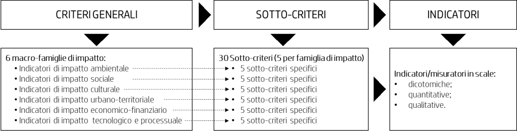 Il processo di selezione delle proposte si è basato su una graduatoria formulata dall’Alta Commissione, sulla base di un set di indicatori di impatto, introdotti all’articolo 8 del D.I. 395/2020 e specificatamente progettati per il Bando dagli autori del presente testo. L’idea di partenza era di individuare un set di misurazioni che fosse, allo stesso tempo, facile da rilevare già dalla fase del Progetto di Fattibilità Tecnica ed Economica, e capace di riflettere, in forma sintetica, l’estensione concettuale alla base del Bando, ovvero, dalla casa all’abitare. Tale estensione interpretativa della qualità dell’abitare comporta un conseguente ampliamento degli obiettivi da perseguire che, dalle sole caratteristiche fisiche del nucleo hard della casa e dai relativi impatti ambientali, vanno a riguardare lo spazio pubblico, i nodi e del sistema della mobilità, la qualità degli spazi condivisi, il livello di coinvolgimento di stakeholder e soggetti del terzo settore, i servizi educativi, il livello di mixitè fra residenze e servizi, le reti sociali esistenti, l’intrattenimento, la cultura, i processi inclusivi innovati e tutti quegli ambiti che riflettono la qualità della vita urbana. A tal fine è stato progettato un set di indicatori, strutturato con uno schema che va dal criterio generale ai sotto-criteri specifici, fino agli indicatori (Figura 1) e capace di mettere in evidenza sinteticamente i diversi elementi degli aspetti sopra richiamati. L’Alta Commissione ha assegnato a ogni criterio in relativo peso numerico consentendo di calcolare il punteggio totale per ogni proposta tramite un processo di normalizzazione dei valori tramite interpolazione per convertire tutti i valori dei criteri in quantità adimensionali, ovvero comparabili. I punteggi finali di ogni progetto sono dati dalla somma dei valori dei punteggi ottenuti in ogni singolo criterio. In questo modo, l’Alta Commissione ha potuto costruire, con un processo trasparente, razionale e ripercorribile un ranking tra le proposte al quale è seguita l’ammissione al finanziamento.