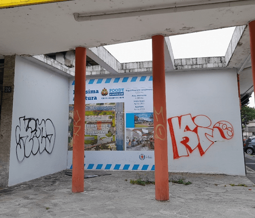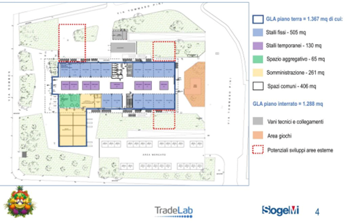 Il progetto di riqualificazione prevedeva la ristrutturazione strutturale, impiantistica e funzionale dello stabile, con la formazione di 19 stalli fissi prevalentemente destinati alla vendita di prodotti alimentari freschi – marchio Foody – (di cui 3 per la somministrazione caratterizzati da un dehors che affaccia sulla piazza) e nove stalli temporanei (concessioni d’uso della durata di 6 anni).