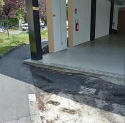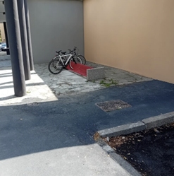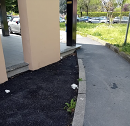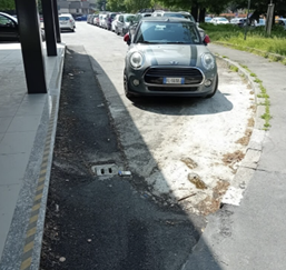 Nulla si sa né è dato vedere poi per quanto riguarda la sistemazione degli spazi esterni: nessuna area gioco, una rastrelliera per bici messa lì in qualche modo, pavimentazioni e cordoli lasciati così com’erano, cioè malmessi, o peggio aggiustati alla bell’è meglio con qualche colata di asfalto nero, macchine parcheggiate ovunque, verde immodificato e senza sfalcio…