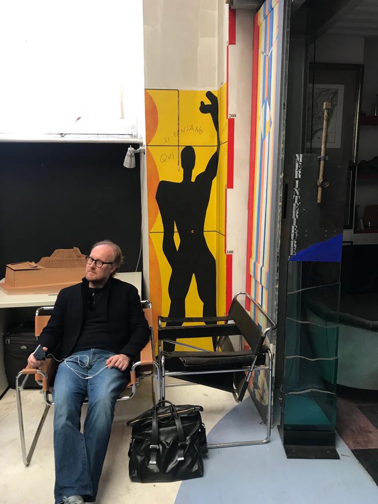 L’edificio dove ha sede lo studio dalla strada appare un anonimo manufatto di inizio Novecento, che si eleva per due piani oltre al piano terra, a cui è stato costruito in aderenza un corpo basso, di un solo piano, ad angolo con via Cardinal Maurizio. La sorpresa inizia a prendere forma quando si varca la soglia d’ingresso e si percorre un lungo e articolato spazio distributivo che non si può chiamare corridoio, che conduce alla porta interna che da accesso al vero studio. Un enorme spazio a tripla altezza completamente libero dal piano interrato al piano secondo, abitato da disegni, modelli, libri, fotografie, tappeti, soppalchi e oggetti vari. Uno spettacolo di colore e creatività difficilmente ripetibile in cui ogni cosa, nell’apparente confusione e disordine, è al suo posto e rappresenta una tappa del percorso della vita da architetto di Andrea Bruno. Si tratta dell’ex laboratorio di Edoardo Rubino – appositamente progettato nei primi anni del 1900 dall’architetto Pietro Fenoglio – scultore torinese piuttosto noto all’inizio del Novecento, autore di monumentali opere dal gusto liberty come, tra le più note, il Monumento nazionale al Carabiniere del 1933 ubicato nei giardini del Palazzo Reale di Torino.