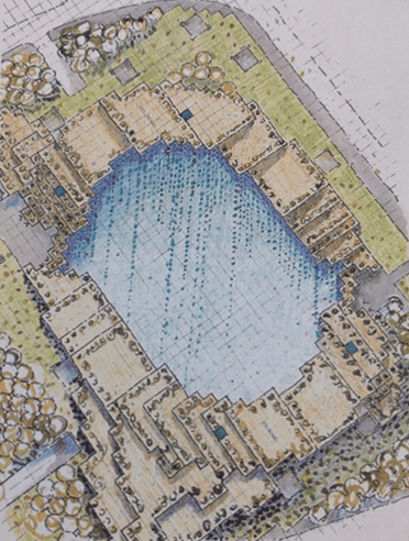 Nell’intenzione di Gabetti & Isola tutto il cortile doveva essere un lago artificiale: il V° Palazzo doveva dare l’impressione di sorgere direttamente dall’acqua ed essere una salus per aquam (spa) anche se solo per la vista. Solo una piccola baia in un angolo avrebbe permesso agli addetti e ai mezzi di poter effettuare la manutenzione periodica.