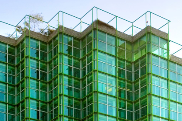 Altro dato di rilievo è rappresentato dalla totale incastellatura dell’edificio con elementi tubolari in alluminio anodizzato e termolaccato di colore verde e diametro 80 mm. Questa incastellatura prosegue in copertura, la oltrepassa per una altezza di circa due metri e la cui funzione può essere intesa come supporto delle piante rampicanti.