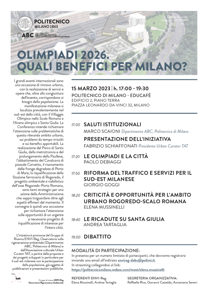 I grandi eventi internazionali sono una occasione di rinnovo urbano, con la realizzazione di servizi e opere che, oltre alla congiuntura dell’evento, corrispondano ai bisogni della popolazione. La manifestazione milanese si localizza prevalentemente nel sud-est della città, con il Villaggio Olimpico nello Scalo Romana e l’Arena olimpica a Santa Giulia. La Conferenza intende richiamare l’attenzione sulle problematiche di questo rilevante ambito urbano, sui problemi da tempo irrisolti e sui benefici apportabili. La realizzazione del Parco di Santa Giulia, della metrotranvia e del prolungamento della Paullese, l’abbattimento del Cavalcavia di piazzale Corvetto, il risanamento delle frange degradate di Porto di Mare, la riqualificazione della Stazione ferroviaria di Rogoredo, il progetto ambientale e viabilistico dell’asse Rogoredo-Porta Romana, sono temi strategici per una azione della Amministrazione che sappia traguardare oltre agli aspetti effimeri del momento. Il convegno è quindi una occasione per richiamare l’attenzione sulle opportunità di un urgente e necessario progetto di riqualificazione di interesse per l’intera città.