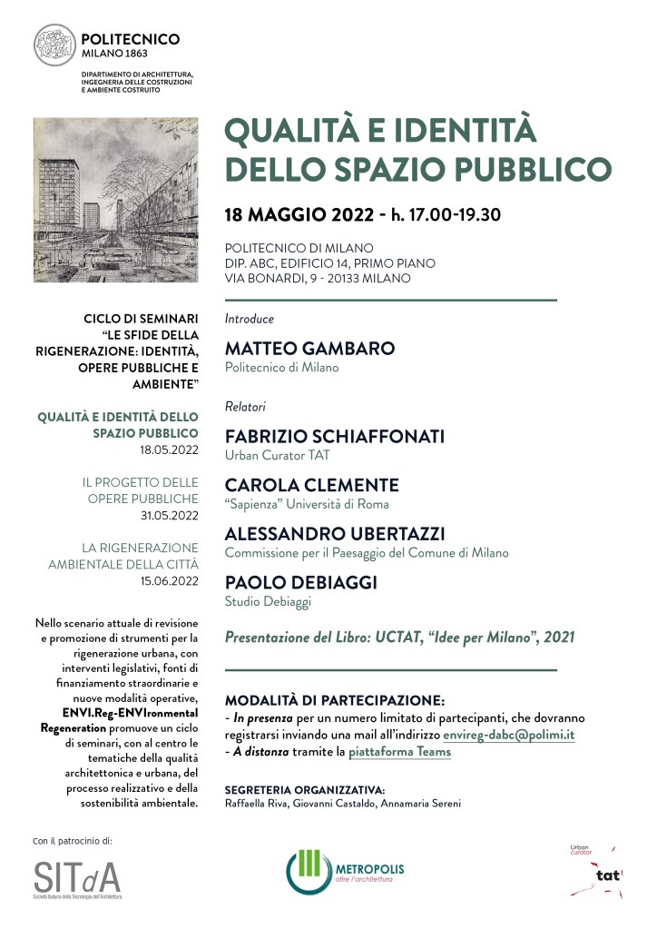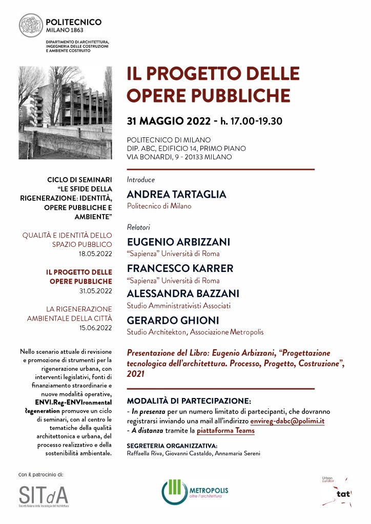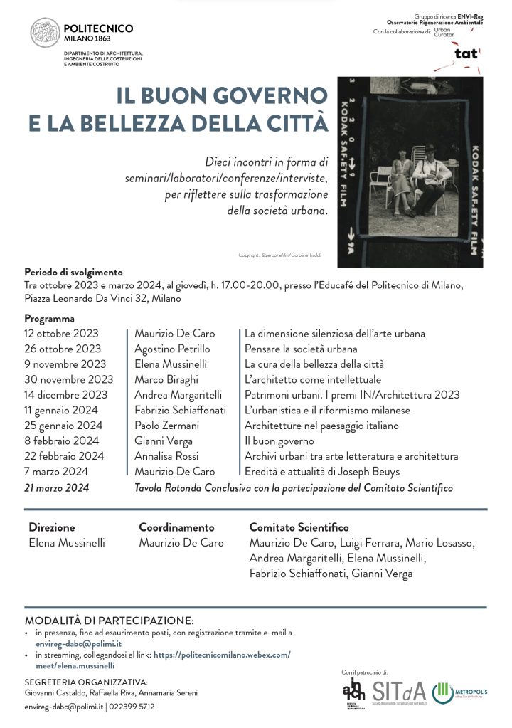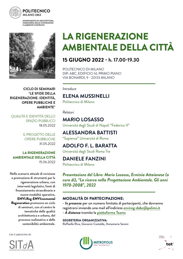 Il ciclo di seminari è promosso dal gruppo di ricerca ENVI-Reg del Dipartimento ABC con l’associazione culturale Urban Curator TAT, e il patrocinio di IN/Arch Istituto Nazionale di Architettura, SITdA Società Italiana della Tecnologia dell’Architettura e Metropolis oltre l’architettura.