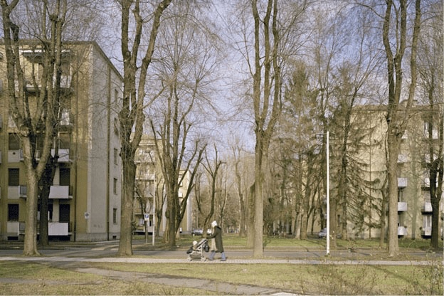 Le strade sono larghe, lontane dalle case, i marciapiedi non sono immediatamente sul ciglio della strada ma ne sono separati da un’aiuola; in molte parti al di sotto di essi passano i tubi per il riscaldamento delle abitazioni che viene fornito da un’unica centrale naturalmente alimentata a metano.