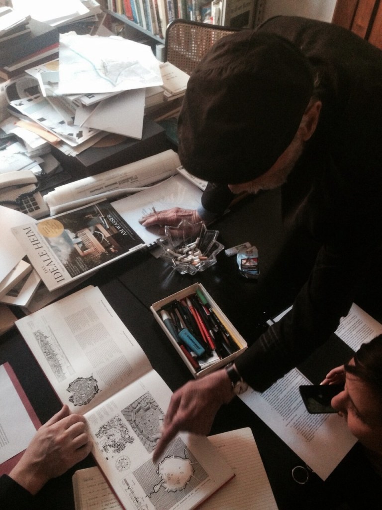 Snozzi ci fa accomodare nella biblioteca/sala riunioni e dopo le presentazioni di rito riempie il tavolo di disegni e grandi fotografie delle sue opere, estraendole da numerosi album che continuano a comparire. Rimane in silenzio, quasi a farci capire che l’architettura non ha bisogno di tante parole per essere compresa, soprattutto da altri architetti. Ce lo fa intuire senza parole e poi lo palesa esplicitamente accompagnando il racconto con timidi sorrisi.