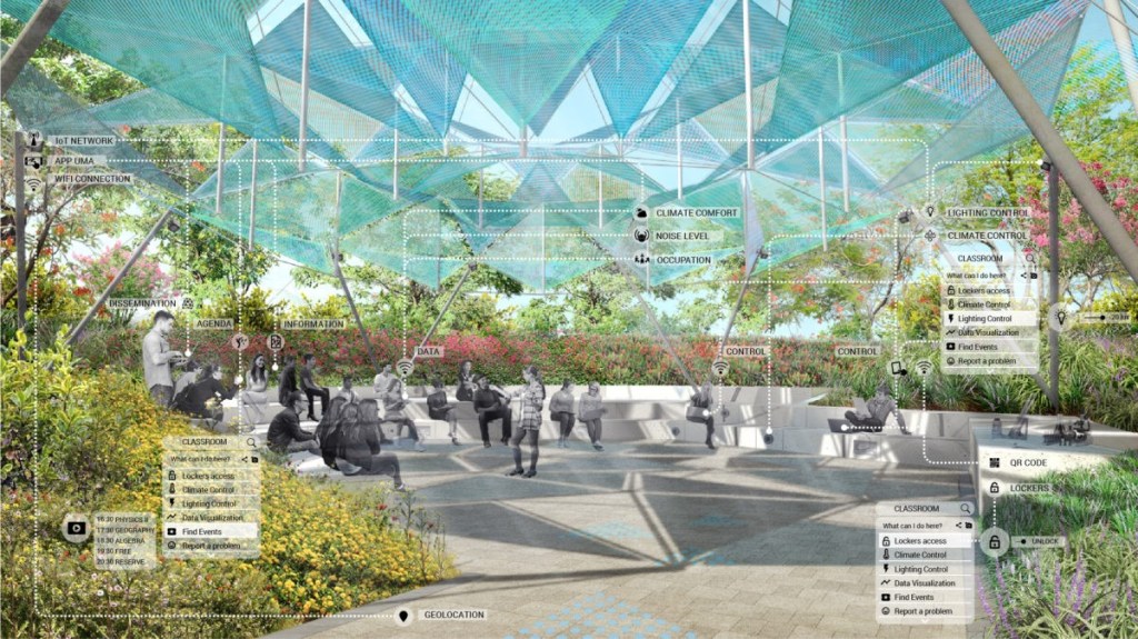 Nella città di Malaga il gruppo di progettazione spagnolo Ecosistema Urbano, dopo essersi aggiudicato una gara pubblica promossa dall’Università della stessa città nel 2016, ha sviluppato il progetto di pianificazione del paesaggio per il Boulevard Louis Pasteur e i principali spazi pubblici del Campus Universitario Teatinos, con una superficie totale di 21 ha (52 ac). Il completamento della costruzione della prima fase, che comprende una superficie totale di 7 ha (17 ac), è in via di ultimazione. Il progetto, in linea con le strategie dell’Università di Malaga, sviluppa il concetto di un campus aperto e innovativo. Al fine di migliorare le funzioni accademiche e sociali all’interno degli spazi pubblici, il progetto crea un ambiente naturale attraente e confortevole, così come incorpora tecnologie ICT, tecnologie bioclimatiche passive|attive e nature based solution che permettono una nuova atmosfera di interazione tra gli ambienti fisici e digitali. Il progetto Louis Pasteur Boulevard permette la rigenerazione di un’area ampia e sottoutilizzata, circondata da infrastrutture. Quest’area si trasforma nello spazio principale del campus universitario, combinando nuovi elementi spaziali e paesaggistici con programmi molto articolati che migliorano il suo comfort climatico e la connettività, mirando a raggiungere il duplice obiettivo di permettere che le attività quotidiane della vita universitaria – l’insegnamento, lo studio, l’incontro o la lettura – si svolgano in spazi pubblici, fornendo al contempo una nuova infrastruttura verde per la città in grado di contrastare i fenomeni estremi dell’isola di calore urbana in estate e i rischi di inondazione invernali (fig.1).