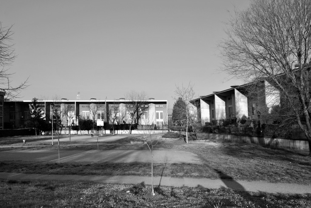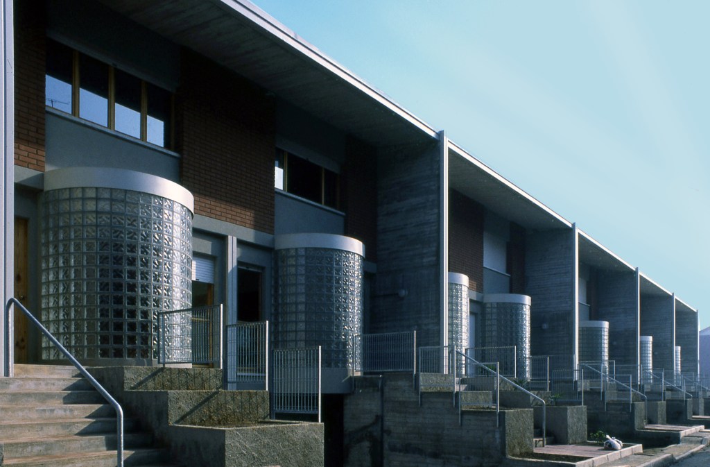 Questi edifici sono al centro dell’abitato, in un lotto del Piano di edilizia economica e popolare completato da altre case a schiera di Gino Valle e Marica Redini. Un complesso in un razionale impianto urbanistico con differenti cifre espressive e tecnologiche delle architetture, ma di una comune ricerca tipologica. La nostra a setti portanti gettati in opera con chiusure esterne in mattoni faccia a vista e vetrocemento; la loro con un sistema di prefabbricazione pesante per le strutture portanti che per i pannelli di facciata, prodotti fuori opera e assemblati a secco. Una sistema da loro già impiegato in edifici multipiano di diverse località. Una scelta inconsueta per case a schiera, ma di forte impatto figurativo per le coperture a falde di ogni unità abitativa che disegnano un suggestivo sky line che richiama le coeve Residenze alla Giudecca e anche immagini di villaggi nordici.