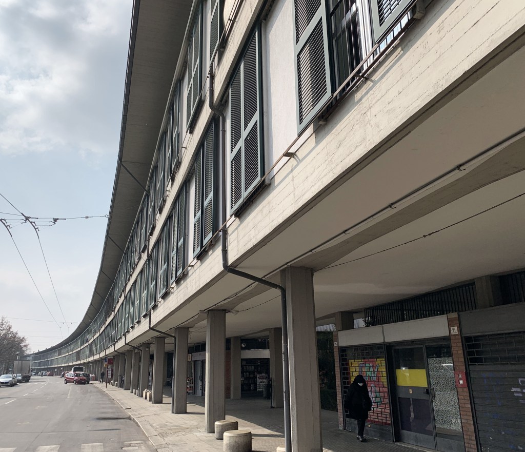 Il piano terra è caratterizzato da un portico nel quale si alternano negozi e spazi aperti, che si propone di riproporre – con le parole di Vaccaro – “la passeggiata coperta, tradizionale a Bologna”; benché in stato di parziale degrado, è stato selezionato nel sistema dei portici bolognesi recentemente riconosciuto parte del patrimonio UNESCO.