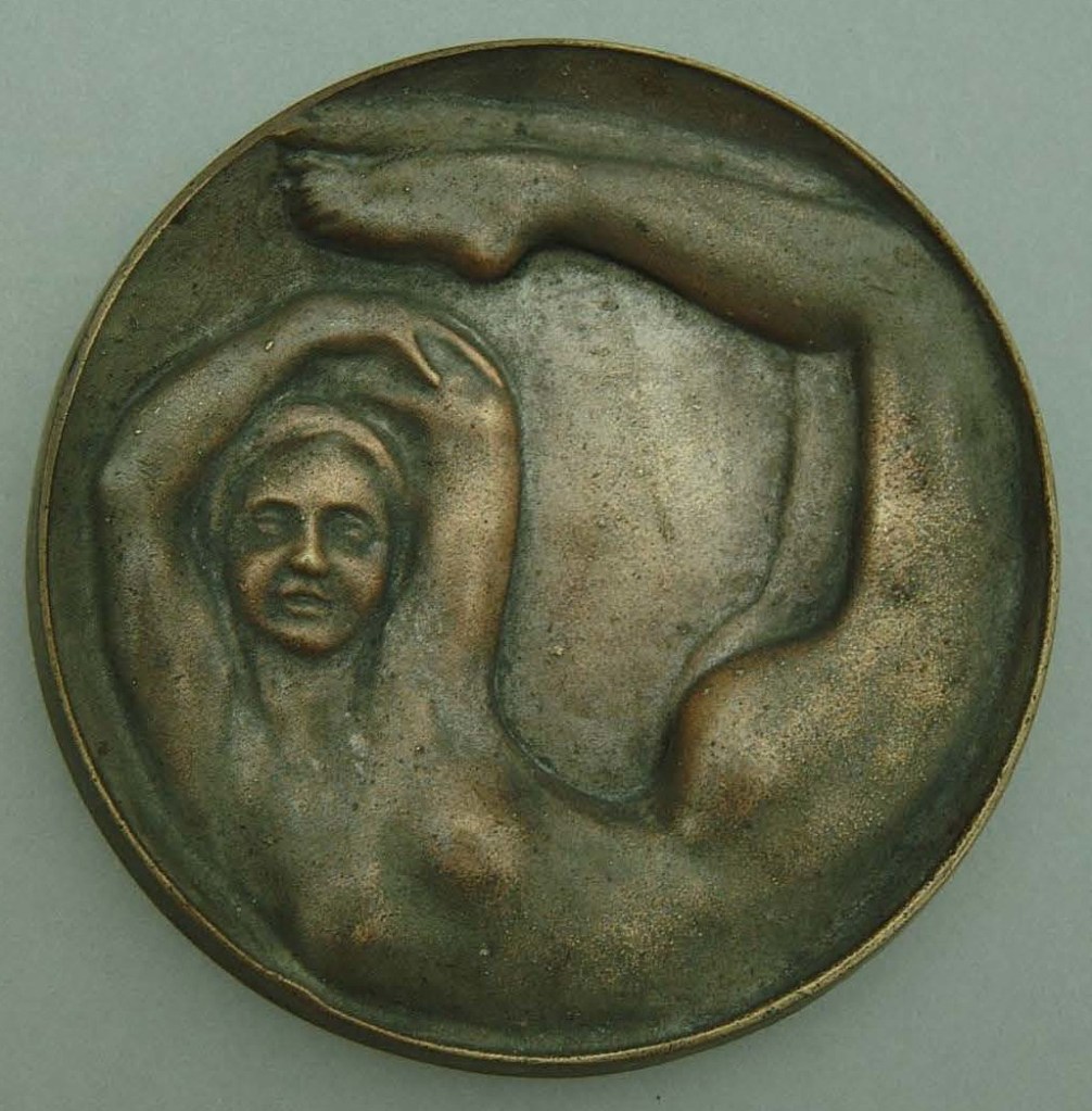 Placca tonda di bronzo “fuso in terra”, non firmata né datata (diam. 156 mm), probabilmente usata anche come posacenere, ambiente italiano, inizio del XX secolo.