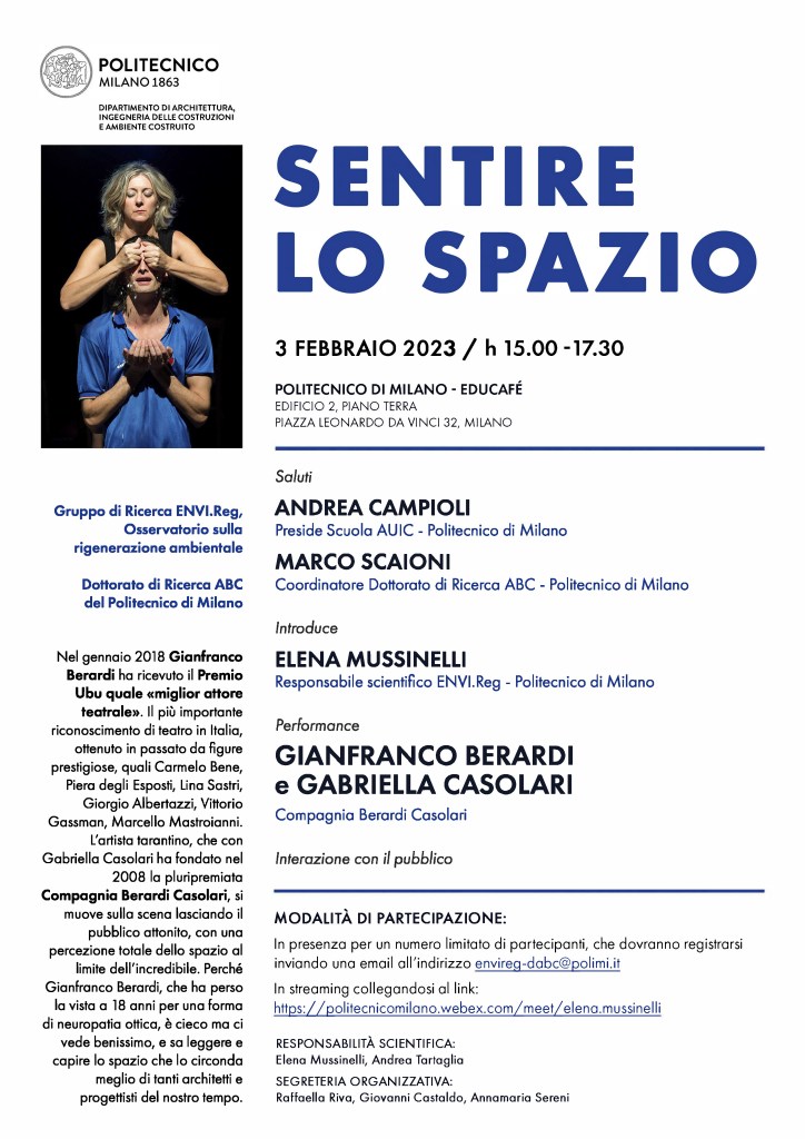 Proprio il tema della percezione complessa e multisensoriale dello spazio – oltre la sola immagine visiva, per individuare modalità inedite di lettura e immaginazione dei luoghi che attraversiamo – sarà al centro del Seminario “Sentire lo spazio”, con performance di Gianfranco Berardi e Gabriella Casolari, organizzato e promosso dal gruppo di ricerca ENVI-Reg coordinato dalla prof.ssa Elena Mussinelli, che si terrà venerdì 3 febbraio 2023 alle ore 15:00 presso lo spazio Educafè del Politecnico di Milano (Edificio 2, piano terra, Piazza Leonardo da Vinci 32, Milano).