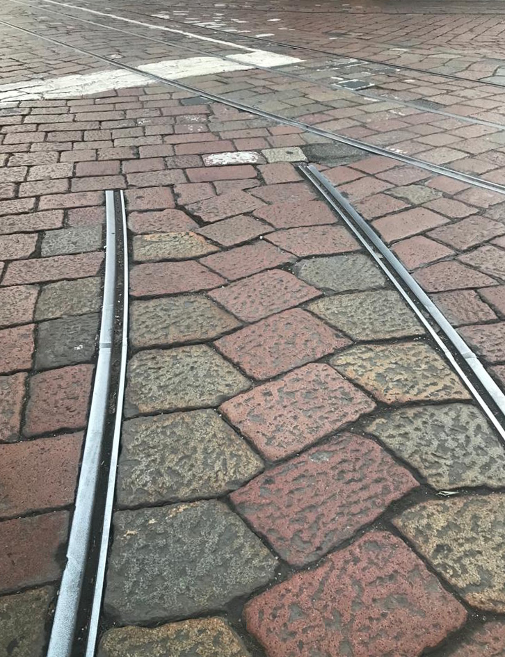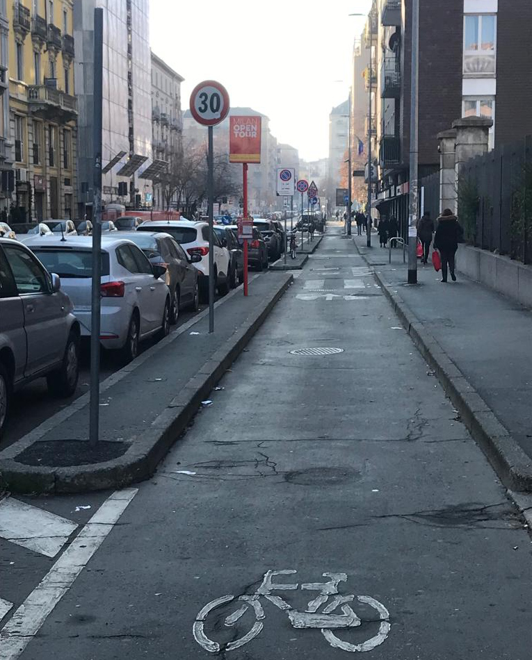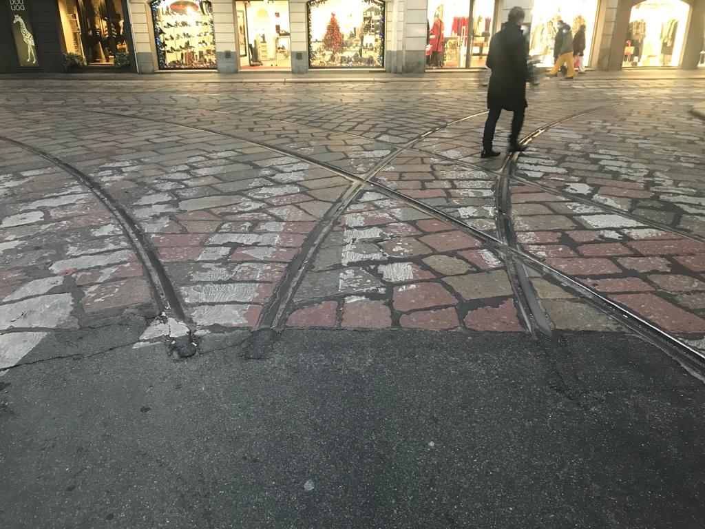 Io che, in questa città, mi sposto prevalentemente in bicicletta, mi aspetterei, ad esempio, che le pietre delle pavimentazioni (oggi troppo spesso sconnesse a causa di un tipo di traffico che, un tempo, non era assolutamente previsto e, comunque, posate con impropria distanza fra loro) fossero meno pericolose di quanto già non lo siano per la pioggia e per il gelo (foto 1).