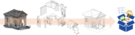 A partire dal dato “grezzo” di rilievo 3D, ossia la cosiddetta nuvola di punti, è possibile restituire rappresentazioni bidimensionali e modelli tridimensionali. Il passaggio dalla nuvola 3D al modello non è automatico, ma è il risultato di un lungo processo di elaborazione e interpretazione dei dati.