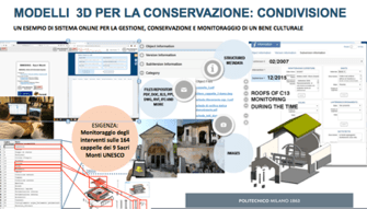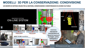 Una volta elaborati i modelli digitali inizia la seconda fase del lavoro, che è quella della condivisione e della messa a disposizione del dato a tutte le figure professionali coinvolte nel processo di valorizzazione del Bene. Qualsiasi attività, sia essa di conservazione, manutenzione e fruizione richiede un approccio multidisciplinare, che risulta facilitato dalla possibilità di lavorare su modelli e dati condivisi. A questo scopo oggi è possibile realizzare anche piattaforme online, che permettono la piena manipolazione e condivisione dei modelli 3D e dei dati informativi ad essi collegati, mettendo in comunicazione figure professionali diverse.