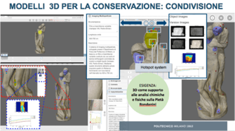 In questa seconda immagine, l’oggetto cambia scala e per mezzo della stessa piattaforma online i modelli 3D vengono utilizzati a sostegno del progetto di conservazione: diventano supporto di localizzazione per le indagini chimico-fisiche, che sono sempre accompagnate da immagini, informazioni testuali e relazioni tecniche.