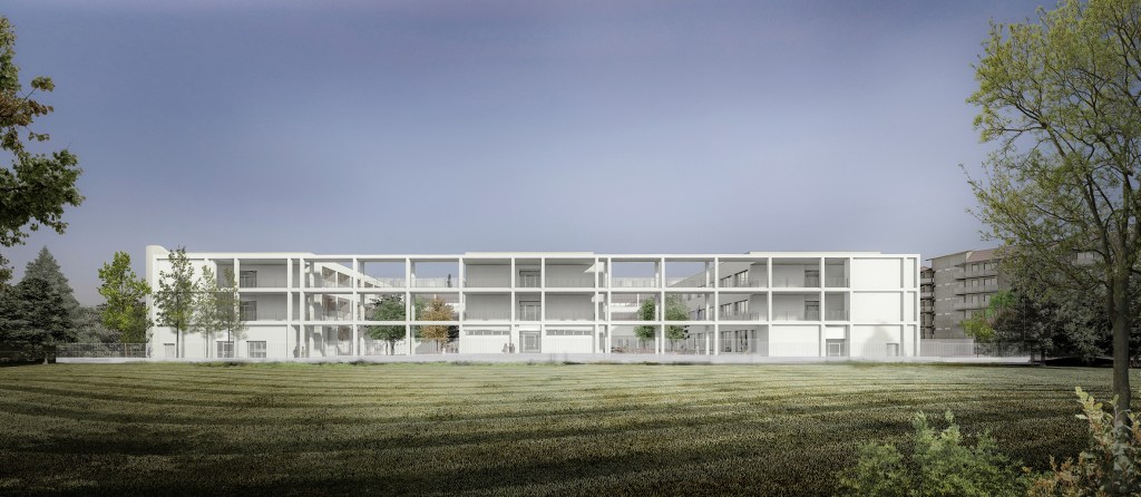 Nonostante i limiti temporali per la produzione degli elaborati e la mancanza di un dibattito che certamente sarebbe risultato necessario e utile per indirizzare i progettisti, edifici virtuosi sono in fase di realizzazione in tutta Italia. In Lombardia sono quattordici i complessi scolastici oggetto di sostituzione edilizia, di cui quattro nei confini milanesi. Tra questi vi è il progetto affidato al raggruppamento costituito da Degli Esposti Architetti S.r.l., prof. arch. Elisa Cristiana Cattaneo, CEAS S.r.l., Rethink Energy S.r.l., Corbo Rosso S.r.l. e dal dott. Umberto Guerra per il nuovo liceo artistico e di studi economici-sociali Giovanni Gastel dell’Istituto Superiore Paolo Frisi sito in via Amoretti 61/63 nel settore nord della città. L’opera rappresenta l’investimento più significativo (26,4 milioni di euro) realizzato con fondi PNRR nell’ambito della Città metropolitana [3] e prevede la realizzazione di 4315 mq coperti distribuiti su 3 piani fuori terra e la sistemazione a verde di ulteriori 5234 mq inseriti in un’area complessiva di progetto di oltre quattordicimila metri quadrati.