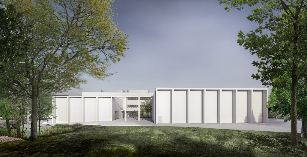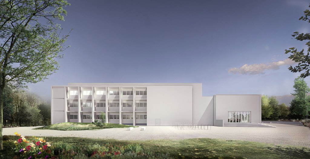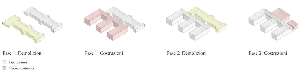 Il progetto sviluppato nell’ambito del PNRR, impostato su un fabbisogno di spazi riferito a 759 studenti a fronte dei 441 attualmente ospitati, può essere letto in pianta come l’accostamento di tre corpi a “L” (di cui l’ultimo privato della sua appendice minore) affiancati sul fronte est da due volumi adibiti a palestra e ad auditorium/ teatro di posa.