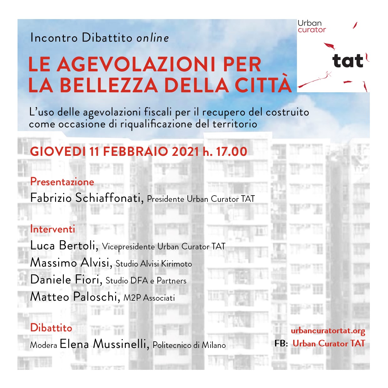 Incontro-Dibattito LE AGEVOLAZIONI PER LA BELLEZZA DELLA CITTA’. L’uso delle agevolazioni fiscali per il recupero del costruito come occasione di riqualificazione del territorio – Giovedì 11 febbraio 2021 h. 17.00 – Intervengono: Fabrizio Schiaffonati, Luca Bertoli, Massimo Alvisi, Daniele Fiori, Matteo Paloschi, Elena Mussinelli.