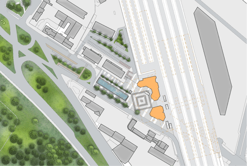 In sintesi la proposta prevede: la formazione di una piazza antistante la Stazione (circa 1.500 mq), con viale di accesso pedonale delimitato da due filari alberati; la realizzazione di una vasca d’acqua con funzione di mitigazione ambientale (60 m x 8 m); la razionalizzazione dell’accesso veicolare e dello stazionamento del trasporto pubblico di superficie; il potenziamento del parcheggio di Ferrovie dello Stato.