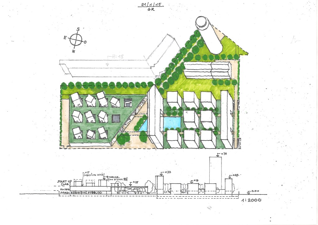 Un giardino lineare, lungo più di 300 metri, bordava tutto il lato sud dei suddetti interventi e separava dalla porzione più a sud dell’area in cui era previsto il recupero di un grande manufatto industriale e la realizzazione di una torre cilindrica di oltre 70 m.