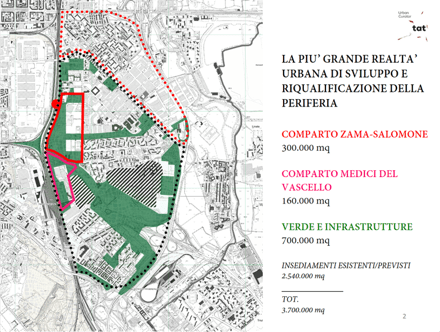3- In adiacenza alla linea ferroviaria (sul lato opposto dell’Ortomercato) si trova il grande comparto delimitato dalle vie Zama, Bonfadini e Salomone, di metri quadrati 300.000, attualmente sottoutilizzato e in parte anche degradato, strategico anche per la presenza della prevista nuova stazione della Circle Line.