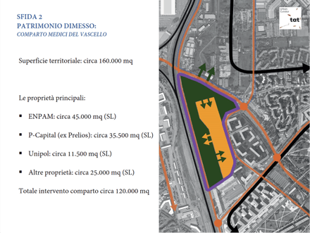2- A ridosso della linea ferroviaria, su una superficie territoriale di circa 160.000 mq, è ubicato il grande complesso immobiliare Medici del Vascello, da tempo abbandonato. Una situazione di degrado e di insicurezza sociale limitrofo al quartiere appena ultimato di housing sociale di Merezzate, in palese contrasto con la qualità complessiva delle nuove realizzazioni.